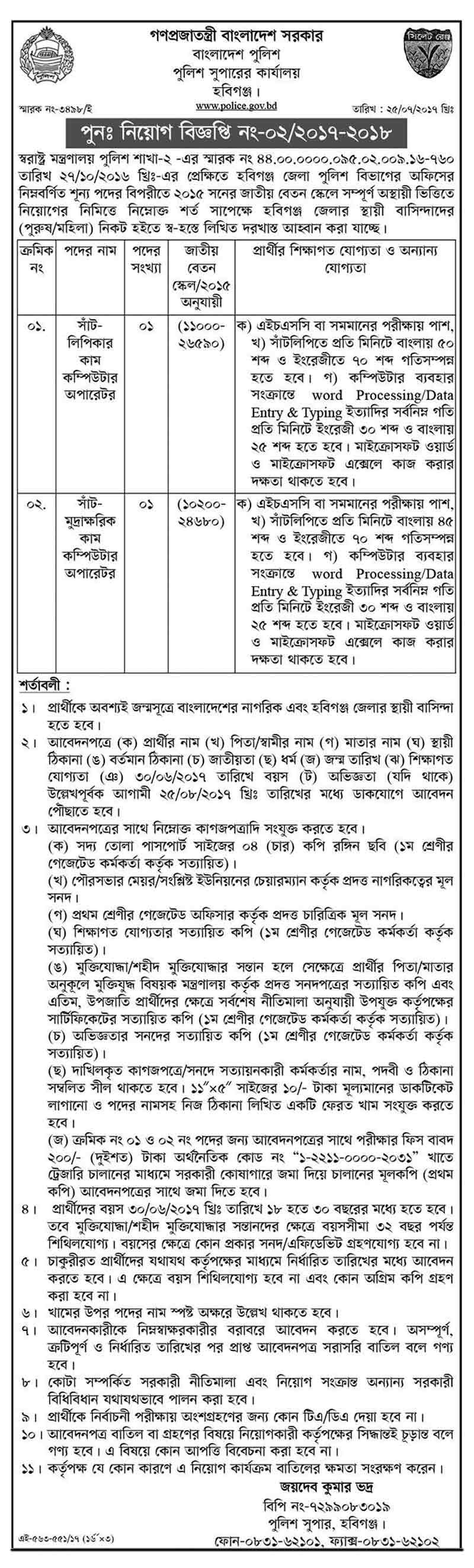 সাঁট মুদ্রাক্ষরিক কাম কম্পিউটার অপারেটর পুলিশ সুপারের কার্যালয়,হবিগঞ্জ